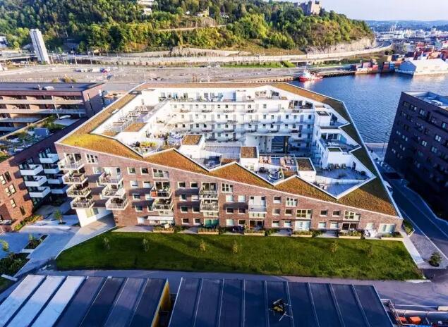 住宅區(qū)最高的北面有八層高,而最低的南面只有一層。其外“殼”是統(tǒng)一的亮黑磚,而內(nèi)部立面和天花板則采用明亮的白色,呼應(yīng)了奧斯陸內(nèi)海峽的海圖圖案。綠色屋頂則為中央公園和周邊的綠色山丘創(chuàng)造了綠色鏈接。